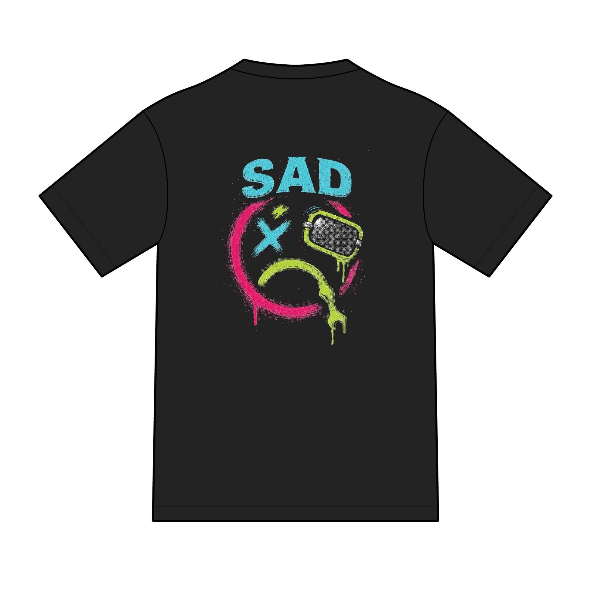 A lightweight, vintage-inspired tee that wears like an old favorite and speaks in neon graffiti. The front carries a small, retro logo over the heart while the back bursts with a spray-painted, melancholy smiley in electric cyan, hot pink, and lime green. It feels casual and lived-in—great for late-night drives, record-shop hangs, or layering under a worn denim jacket. The soft tri-blend drapes gently and breathes easily, so the graphic stays bold without feeling stiff against your skin.