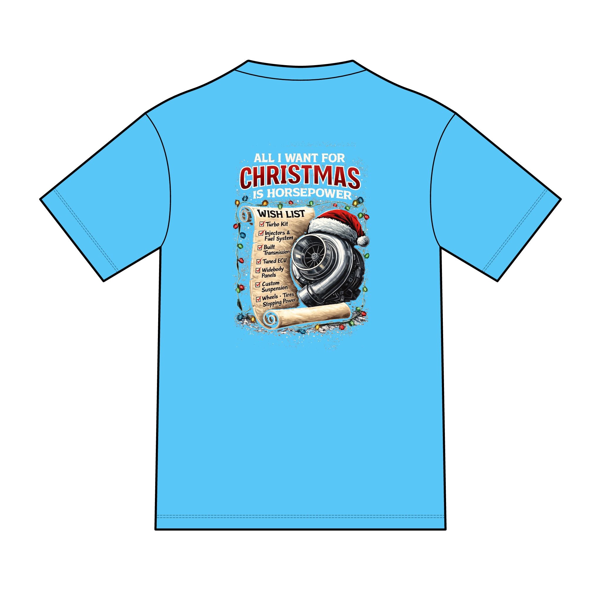 Theme/Features: Holiday automotive theme; turbocharger and Christmas motif; contrast small chest print with large back artwork